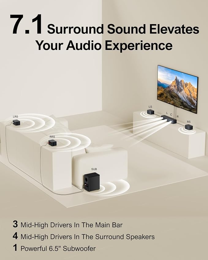 7.1ch Virtual Surround Sound System: Upgraded from the 5.1ch Poseidon D50, the Poseidon D70 meets more needs with enhanced surround sound. Enjoy crystal-clear dialogue from three main channels, 4 wired surround speakers, and a 6.5" wireless subwoofer for a wider sound field. (Note: Not compatible with Dolby Audio/Atmos.)